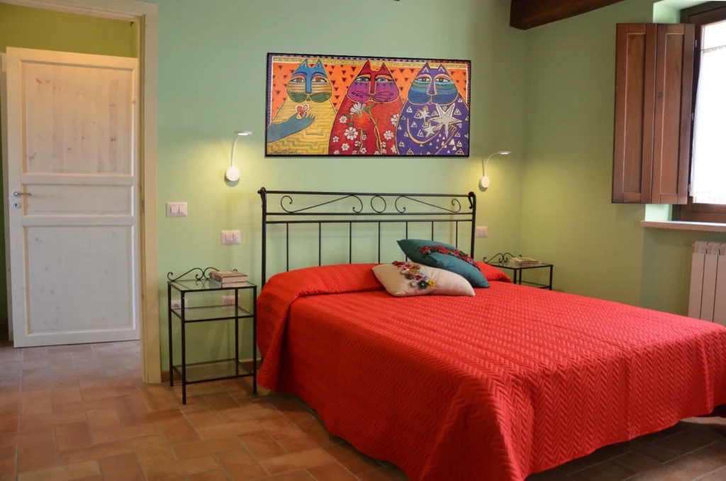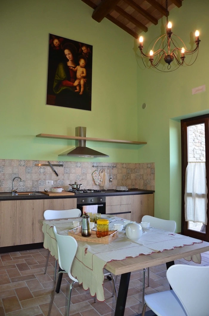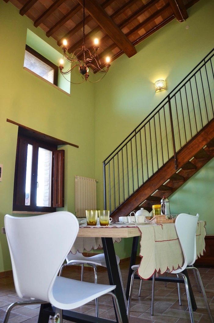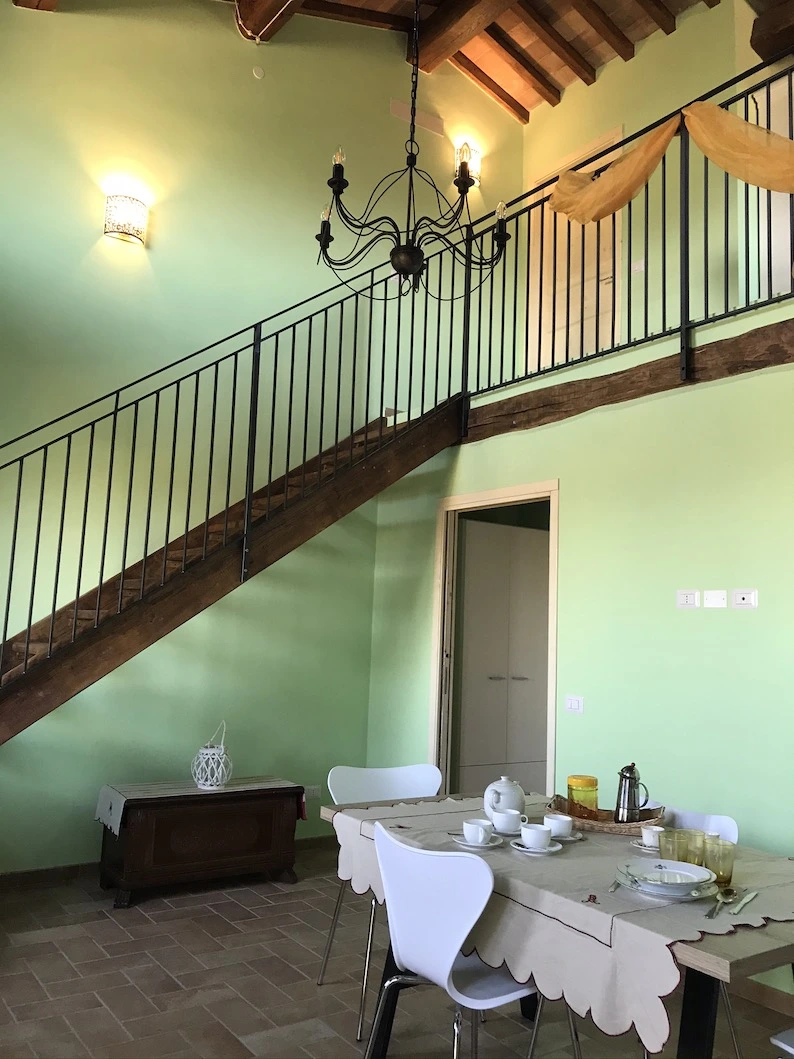 Le finiture tipiche umbre e l’atmosfera calda rendono questo appartamento perfetto per famiglie o due coppie in cerca di comfort e privacy.